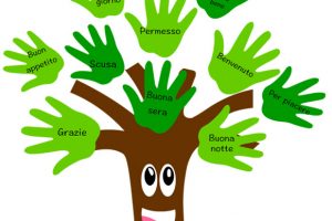 La mano sinistra nell’immagine mostra cinque dita colorate, ognuna con un simpatico bambino disegnato sopra, che ci ricorda una regola importante per la scuola: