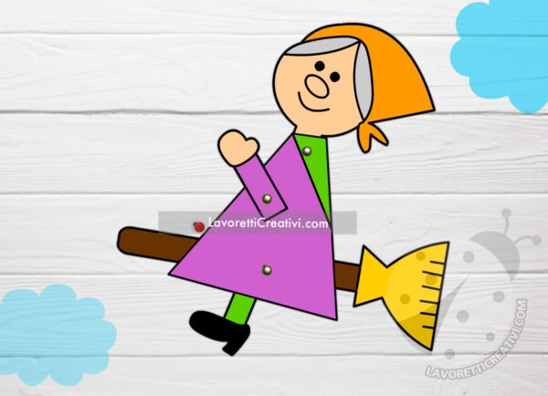 Befana di carta con fermacampioni da stampare, ritagliare e assemblare. Una simpatica Befana con scopa, corpo, testa e braccio mobile. Divertiti a costruire la Befana sulla scopa, stampa le sagome in formato PDF. Clicca qui