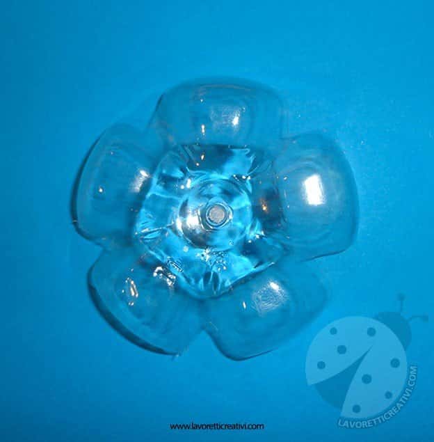 Fiocco di neve realizzato con il fondo di una bottiglia di plastica, colori acrilici e porporina.
