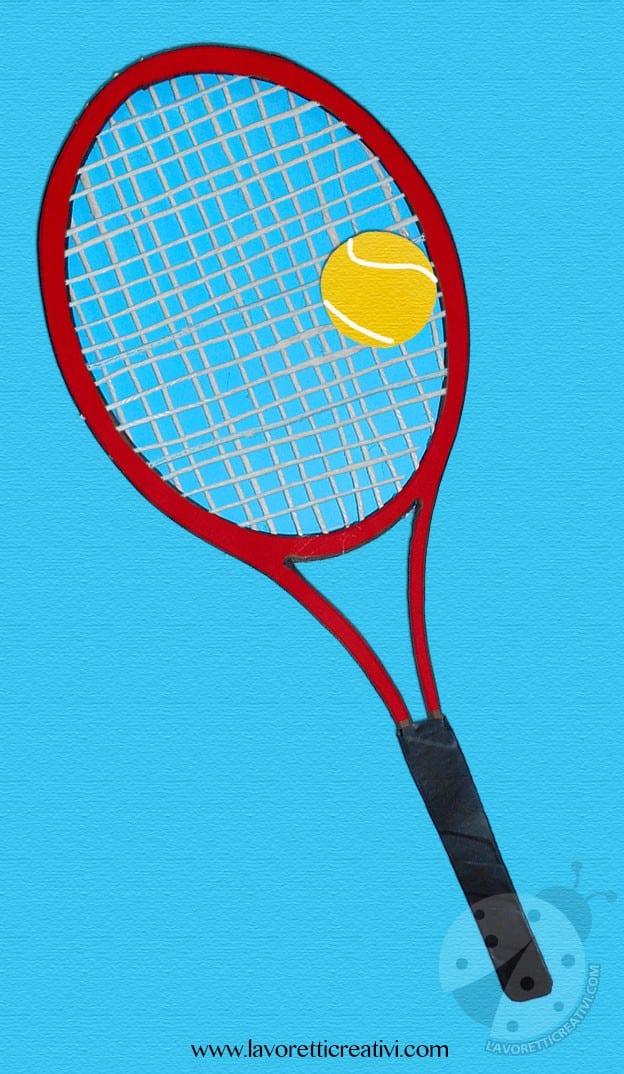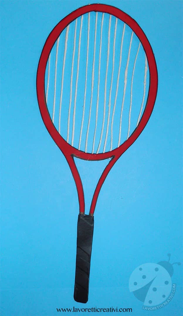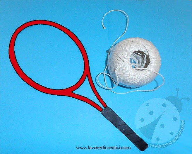 Semplice racchetta da tennis da realizzare con cartoncini colorati, spago e nastro adesivo.