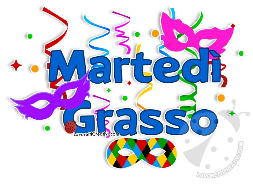 Martedì Grasso scritta con mascherine di Carnevale e coriandoli.