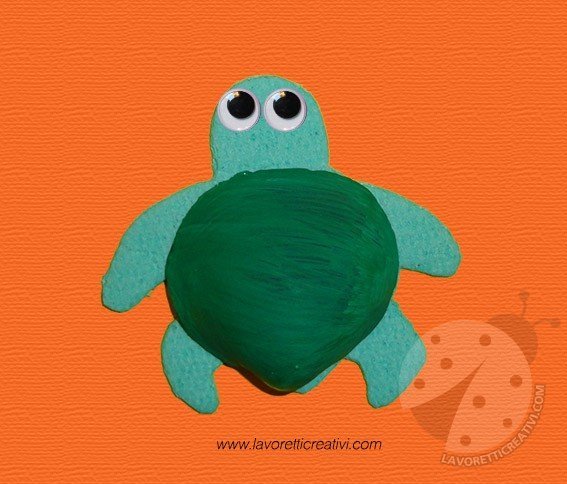 Infine si aggiungono piccoli occhi mobili sulla testa della tartaruga, che la trasformano in un personaggio allegro e vivace. Ogni bambino potrà decidere se posizionarli dritti, un po’ storti o buffi per dare carattere alla propria creazione.